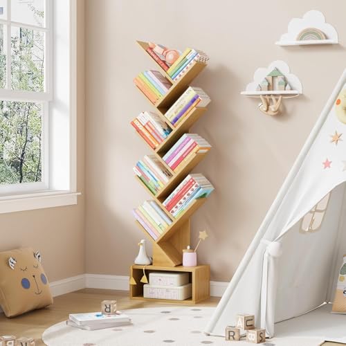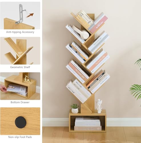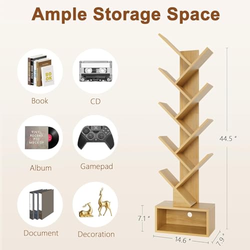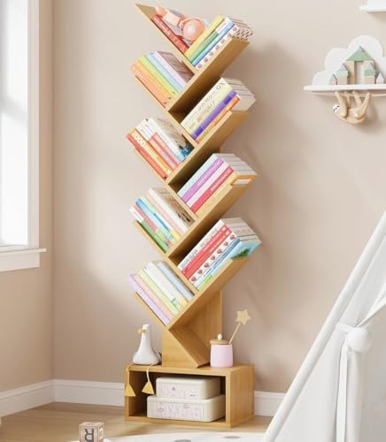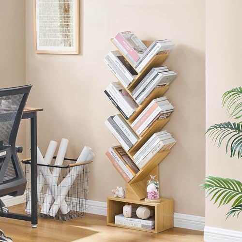 Fohome - رف كتب بتصميم شجرة من 10 طبقات، خزانة كتب خشبية صغيرة مع خزانة تخزين، خزانة كتب طويلة ضيقة للأقراص المضغوطة/الأفلام/الكتب، أرفف منظمة للكتب للمنزل والمكتب وغرفة المعيشة وغرفة النوم من فوهوم (بني)