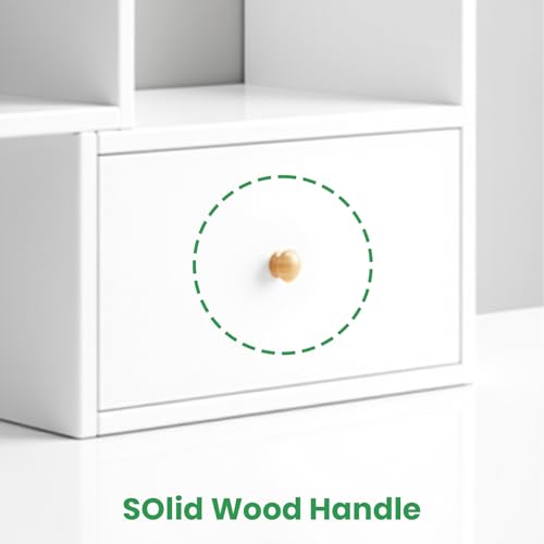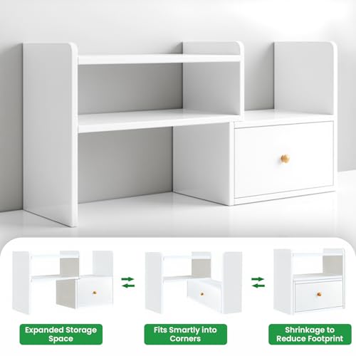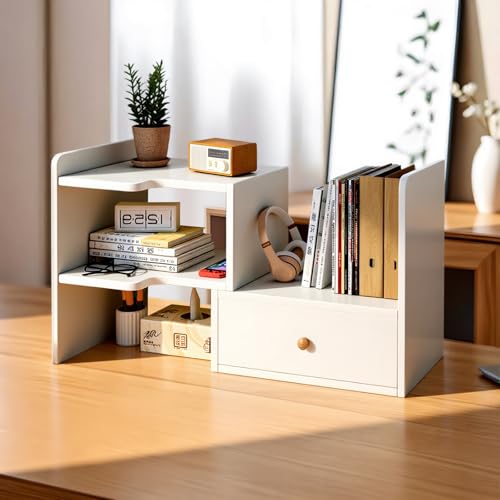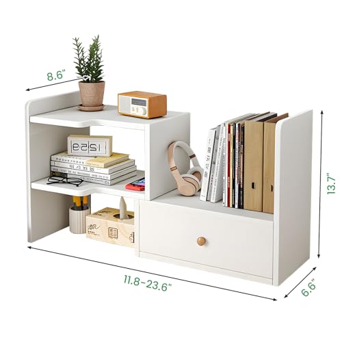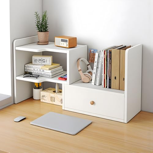 Fohome - رف كتب مكتبي مع درج من فوهوم، ارفف مكتبية، منظم تخزين، رف منظم مكتبي مع ادراج ارفف تخزين، رف تخزين خشبي لسطح الطاولة، رف عرض وتخزين الكتب (ابيض)