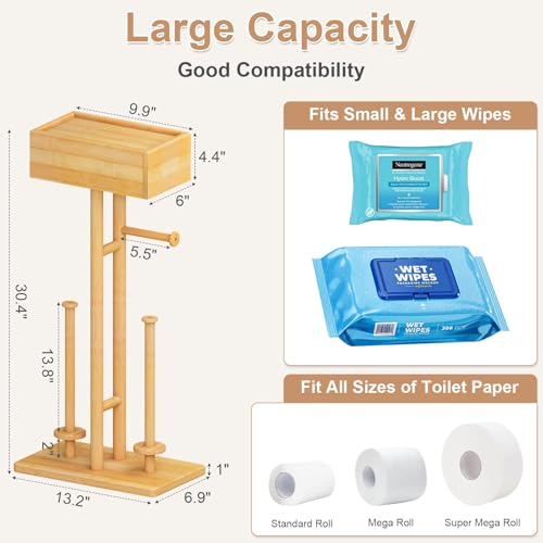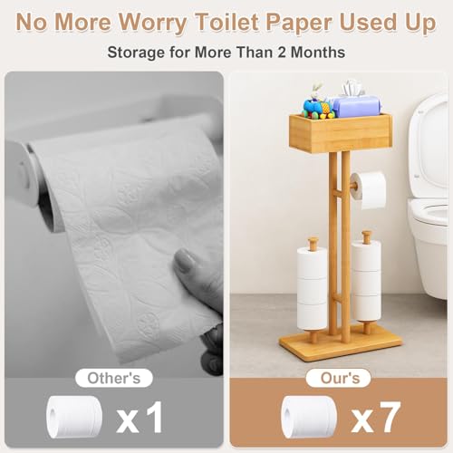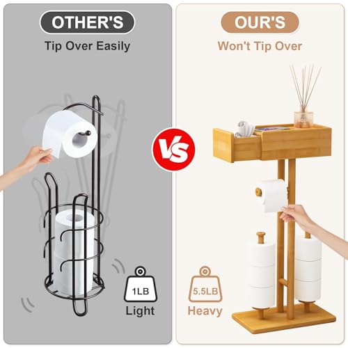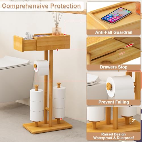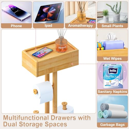 Fokyfok - حامل ورق تواليت من الخيزران مع رف، حامل ورق تواليت خشبي قائم بذاته، حامل ورق تواليت قائم بذاته مع درج، حامل ورق تواليت مع تخزين مناديل للحمام، حامل تي بي