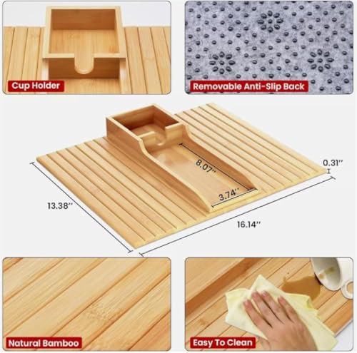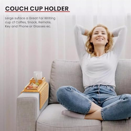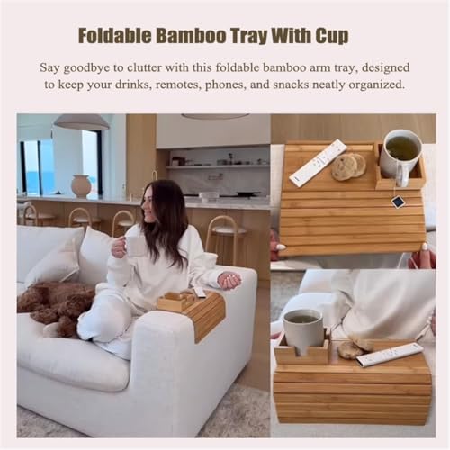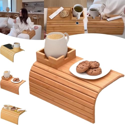 Rietoiu - صينية بامبو قابلة للطي مع حامل اكواب، صينية حامل اكواب للاريكة من الخيزران الجديد 2025، صينية قابلة للطي بذراع الاريكة، حامل اكواب قابل للفصل ومضاد للانزلاق، للاكواب والوجبات الخفيفة (A)