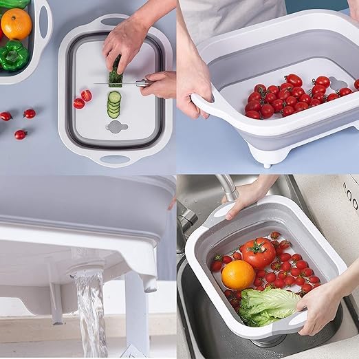 - (لوح تقطيع سيليكون 3 في 1) أولًا، مع إصدار محسن من وظيفة التصريف، يمكن استخدام لوح التقطيع القابل للطي لتخزين المياه وتفريغها. ثانيًا، يمكن استخدامها كألواح تقطيع للخضروات والفواكه واللحوم. والثالث عبارة عن حوض قابل للطي لغسل الأطباق أو الطعام. يعمل هذا المنتج بشكل مثالي في تقطيع الخضار.