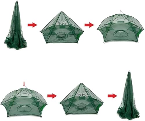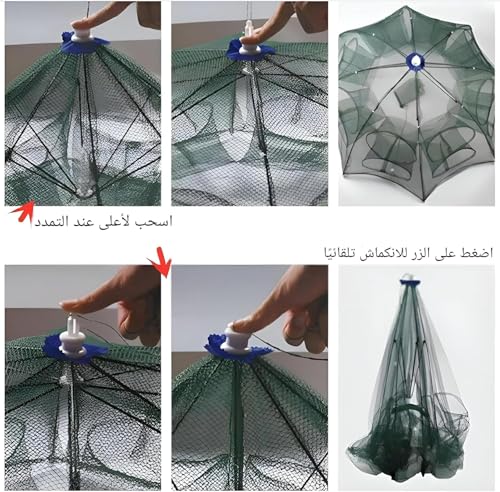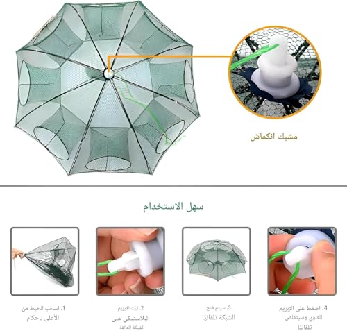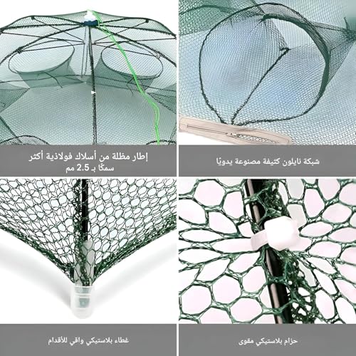 - تصميم متعدد الاستخدامات: مصيدة شبكة صيد على شكل مظلة من 8 جوانب مع نقاط دخول متعددة لصيد الأسماك والروبيان وسرطان البحر والمخلوقات المائية الأخرى