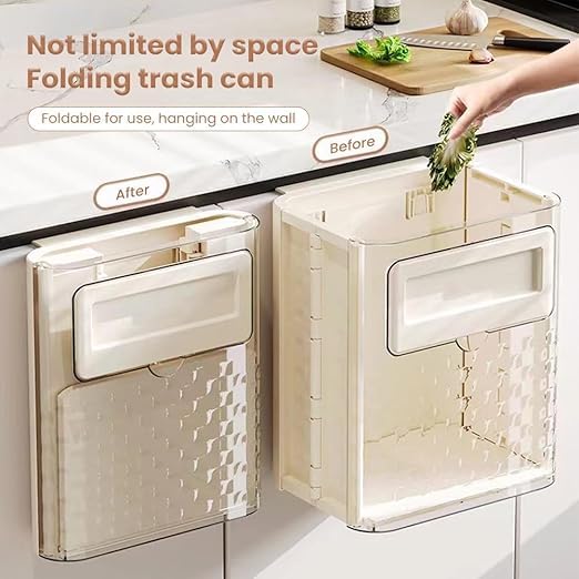 - تصميم موفر للمساحة: تتميز سلة المهملات المعلقة الخاصة بنا بتصميم قابل للطي، يمكنك طيها عند عدم استخدامها، لذلك لن تشغل مساحة في مطبخك.