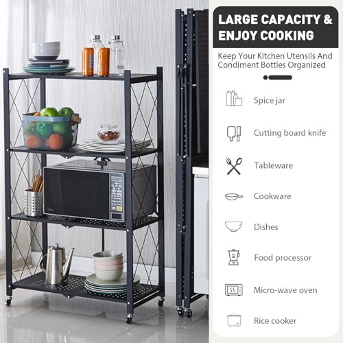 AOMINOHOMA - اي او مينوهوما ارفف معدنية قابلة للطي من 4 طبقات، رف تخزين، وحدة رفوف تخزين معدنية شديدة التحمل مع عجلات للمراب والمطبخ تحمل حتى 440 باوند بدون تجميع، اسود