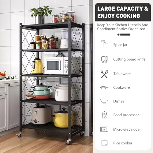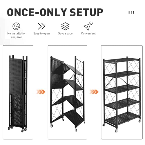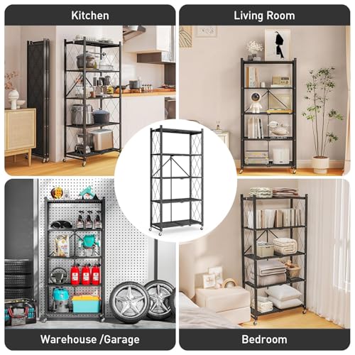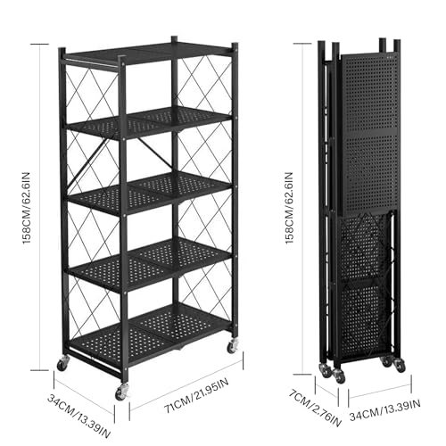 AOMINOHOMA - رفوف قابلة للطي بعجلات - ارفف قابلة للطي بدون تجميع، وحدة رفوف قابلة للطي، منظمات المطبخ والتخزين، رف شديد التحمل منبثق، 5 طبقات، اسود 28 انش عمق × 14 انش عرض × 63 انش ارتفاع