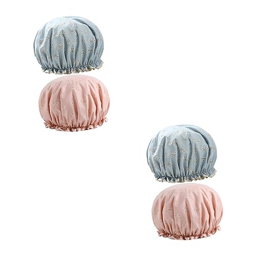 FOMIYES - فوميز. قبعات نسائية من 4 قطع، قبعة شعر بونيه جميلة لطيفة + طبقة مزدوجة زرقاء + غطاء مزدوج للنوم من الساتان الأزرق ايفا مطبوعة للمرأة، قبعة بلاستيكية للفتيات / قبعة ساتان سميكة بينك للاستحمام