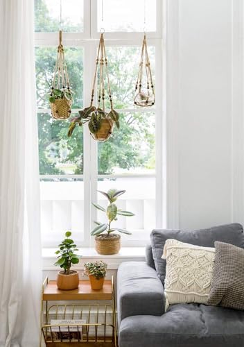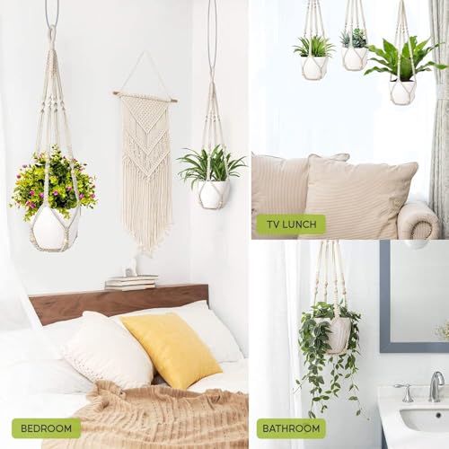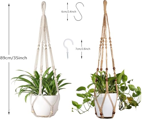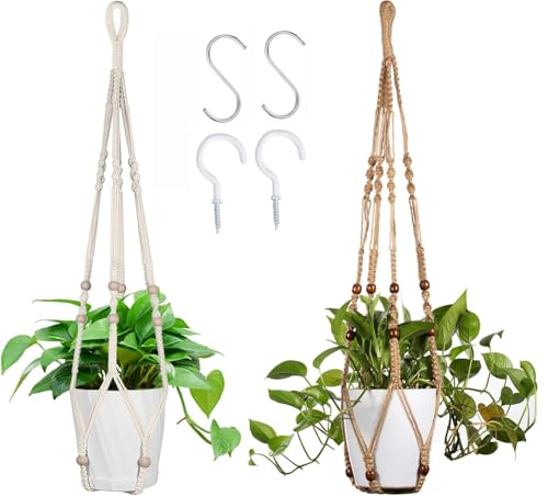 FonVan - سلة زهور مكرمية من فونفان، سلة معلقة بحبل قطني للنباتات للاستخدام الداخلي والخارجي والسقف والجدار والشرفات، حامل وعاء زهور مع 2 خطاف على شكل حرف S وخطافات لولبية، 2 قطعة