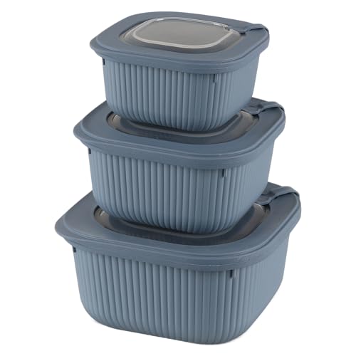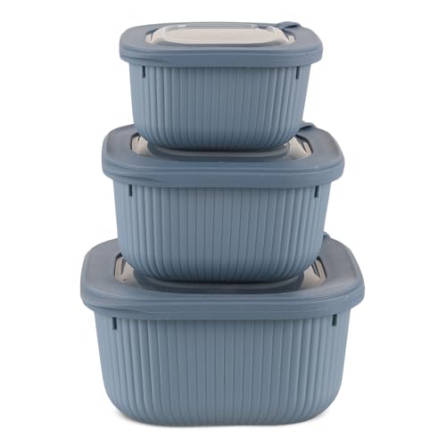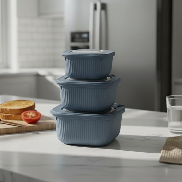 Generic - طقم علب حفظ طعام 3 قطع مع غطاء، مربع، بلاستيك مع سيليكون - أزرق كحلي مطفي