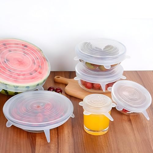 - تأتي هذه الأغطية بستة أحجام مختلفة، مما يسمح لها بملاءمة مجموعة متنوعة من الحاويات والأوعية والبرطمانات وحتى الفواكه غير المنتظمة الشكل مثل البطيخ والشمام، مما يجعل تخزين الطعام متعدد الاستخدامات ومريح.