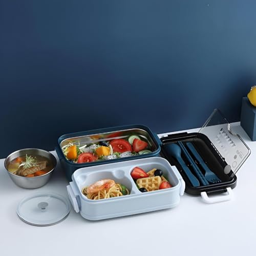 Generic - علبة حفظ طعام، لانش بوكس بلاستيك 3 طبقات بمشابك مانعة للتسرب مع عيدان الطعام وشوكة وملعقة وغطاء شفاف لتناول وجبات صحية أثناء التنقل