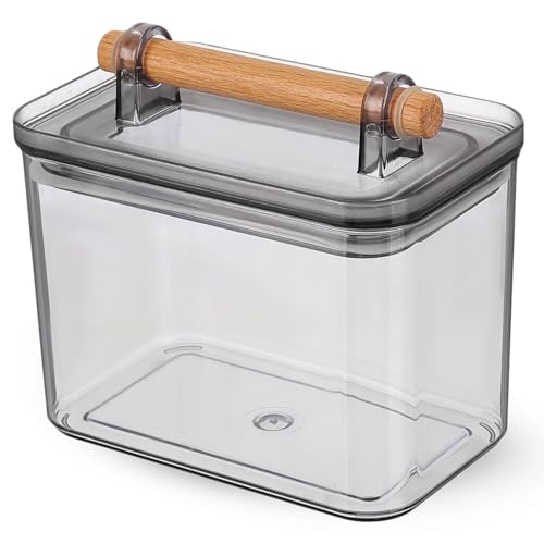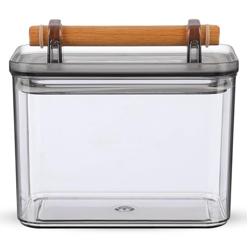 - تصميم فاخر: حاوية تخزين طعام أكريليك أنيقة مع مقبض خشبي أنيق ولمسات رمادية، مثالية لتنظيم المطبخ الحديث