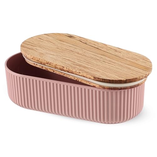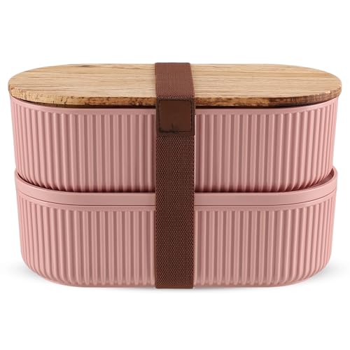 Generic - مجموعة علب تخزين الطعام، 1000 مل و2000 مل، تصميم بيضاوي مع غطاء خشبي، بينك