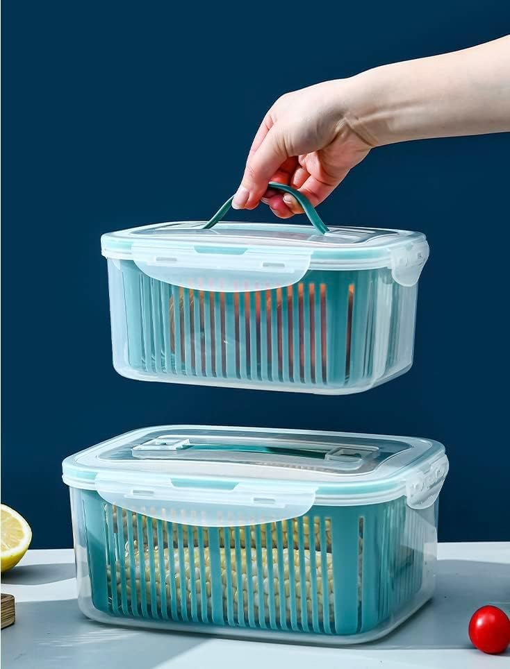 - مواد عالية الجودة: مصنوعة من مادة PET عالية الجودة صالحة للطعام. حاوية التخزين الشفافة تجعل من السهل العثور على ما تبحث عنه، كما تجعل من السهل غسل الفواكه والخضروات. يمكن لسلة المصفاة أن تساعد الطعام على تجنب نقعه في الحاوية ويمكن استخدامها كمصفاة لغسل الفواكه والخضروات.