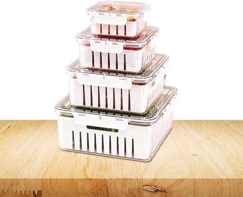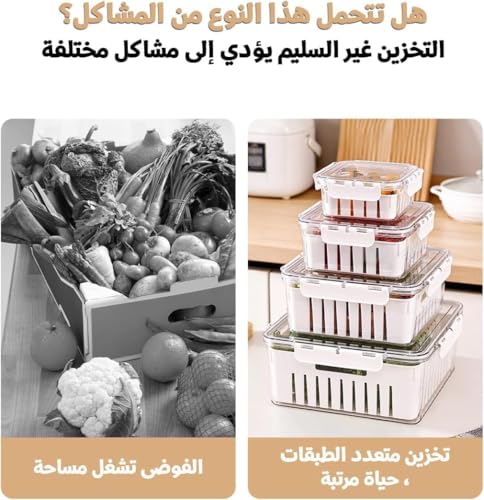 - حاويات تخزين الطعام مع أغطية، مجموعة منظم الثلاجة المكونة من 4 قطع مع سلة تصريف تحافظ على الخضروات والفواكه طازجة لفترة أطول مع توفير مساحة الثلاجة الثمينة، مما يجعل إعداد الوجبات أسهل وأكثر متعة.