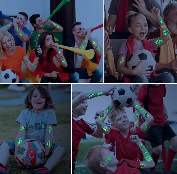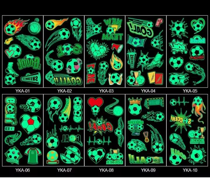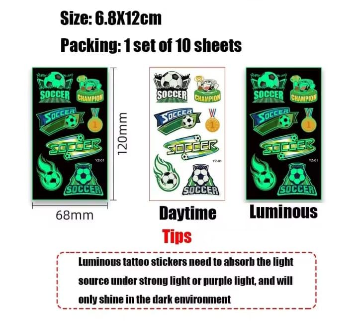 - محتويات العبوة: مجموعة من 10 أوراق تتميز بملصقات تاتو مؤقتة مختلفة بطابع كرة القدم مع تأثيرات مضيئة ولامعة تتوهج في الظلام.