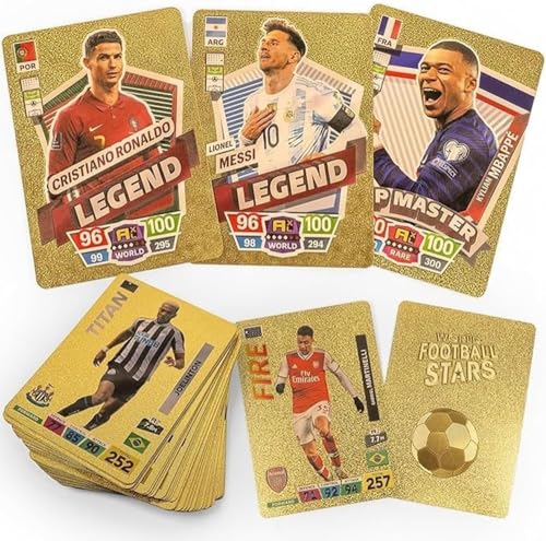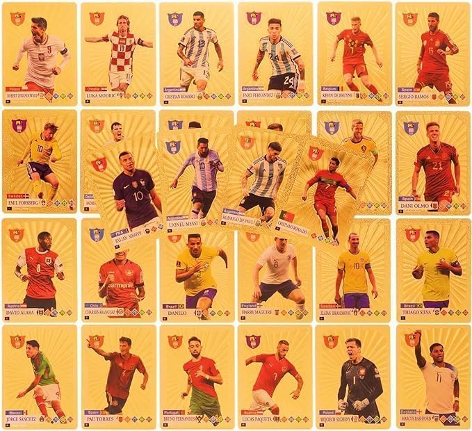 - مجموعة من 55 قطعة: تتضمن مجموعة متنوعة من 55 بطاقة فويل ذهبية تضم لاعبي وفرق كرة القدم.