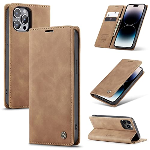 Generic - جراب موبايل جلد قابل للطي افقي متعدد الوظائف لموبايل ايفون 14 برو ماكس من كيس مي 6.7 بوصة بني منقلب