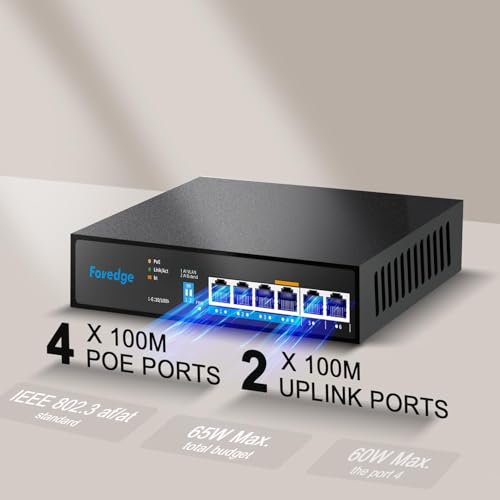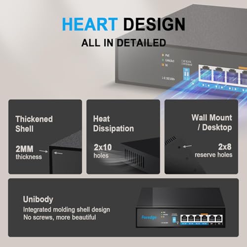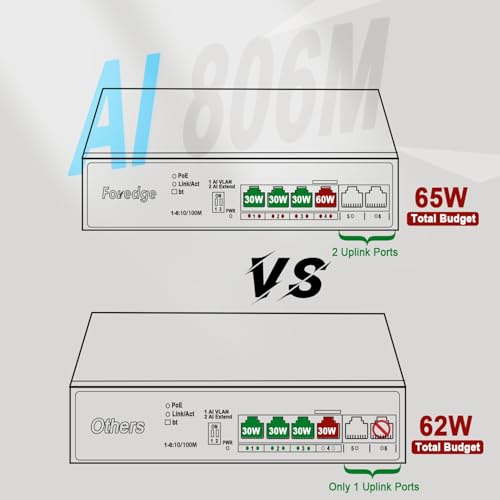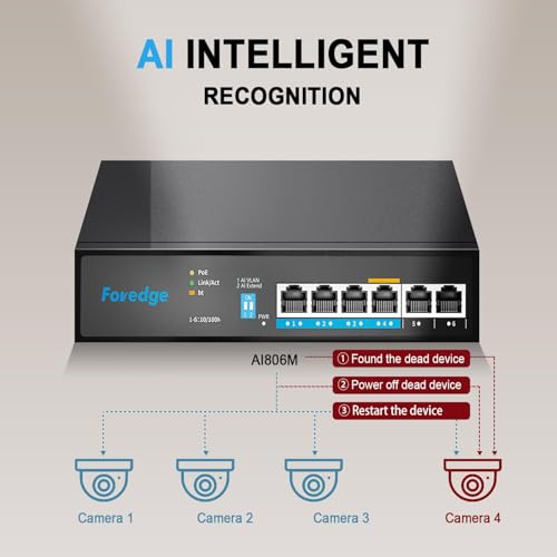 Foredge - محول AI806M بـ 6 منافذ PoE++ من فوريدج، 4 منافذ PoE+ @65 وات، موزع شبكة ايثرنت، 60 وات + 2×10/100 متر انترنت اب لينك | معدن بالكامل | شبكة محلية بالذكاء الاصطناعي والتمديد | استعادة تلقائية