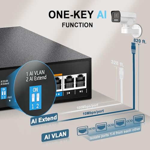 - سهل التوصيل والتشغيل والتركيب: يعمل مفتاح AI806M PoE بشكل مثالي مع كاميرات PoE الخاصة بك. لا حاجة إلى برامج إضافية أو برامج ثابتة، سهل الإعداد حتى للمبتدئين. يمكنك تركيب مفتاح PoE على الحائط أو سطح المكتب، وهو حل مثالي لمجموعة متنوعة من البيئات.