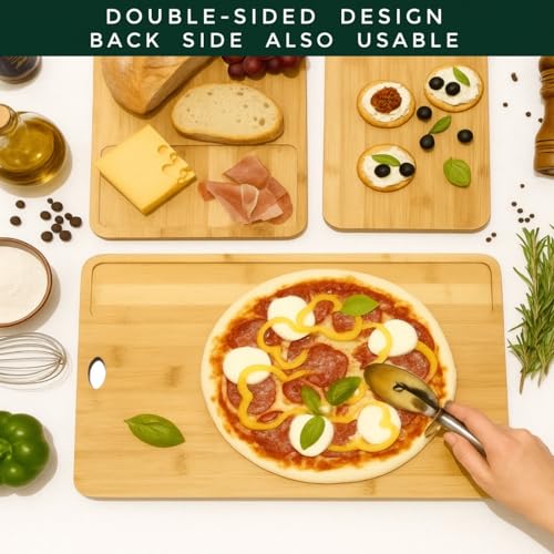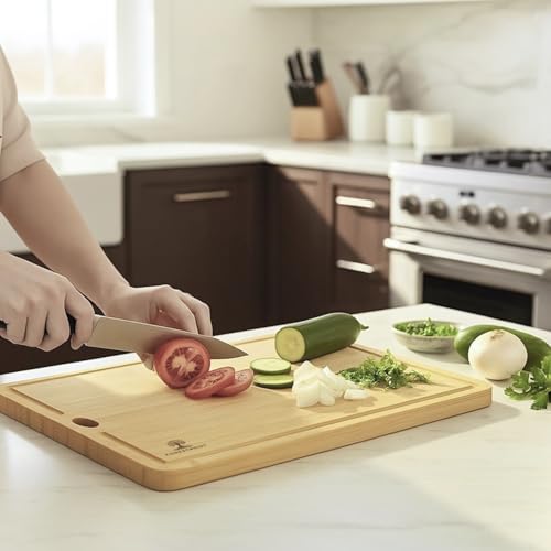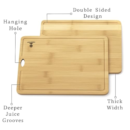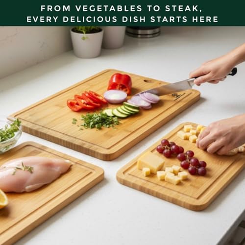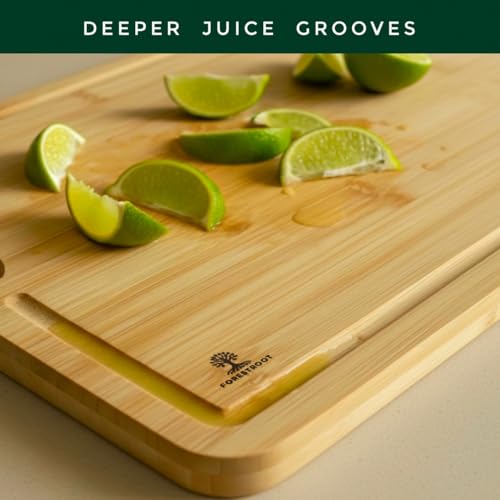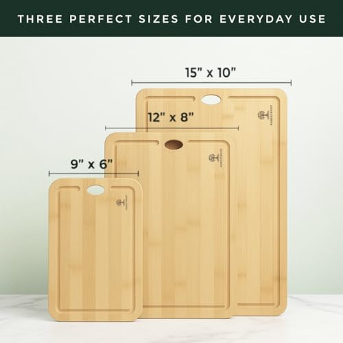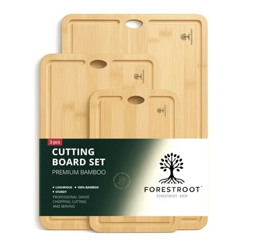 Forestroot - مجموعة الواح تقطيع من الخيزران من فورستروت - 3 قطع من الواح الخيزران الطبيعي مع اخاديد عصير عميقة وفتحات تعليق، الواح تقطيع خشبية صديقة للبيئة للمطبخ، مثالية لتقطيع اللحوم والخبز والفواكه