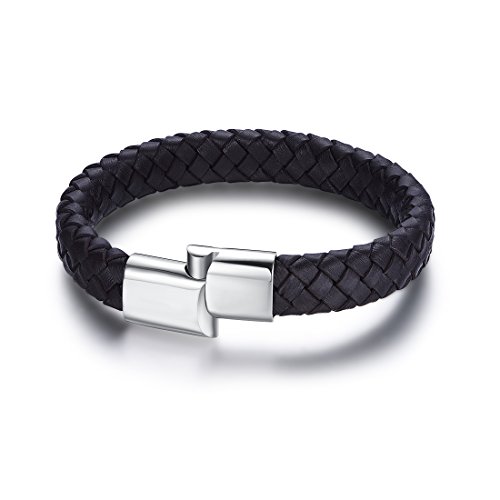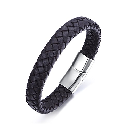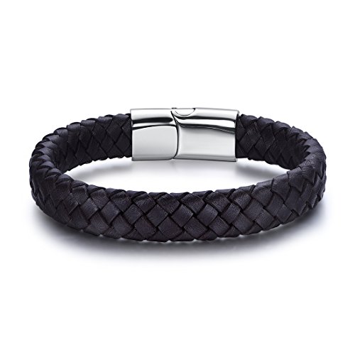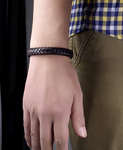 FOSIR - سوار FOSIR بسيط للرجال من الجلد الطبيعي مجدول من الفولاذ المقاوم للصدأ مشبك مغناطيسي 8-8.5 بوصة