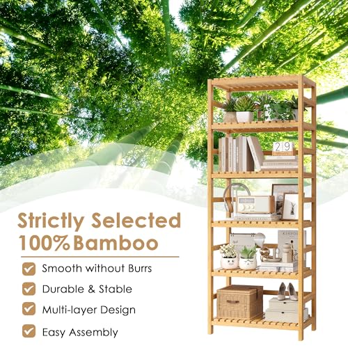 FOTOSOK - رف كتب من الخيزران من 6 طبقات، خزانة كتب مع رفوف قابلة للتعديل بتصميم قائم بذاته، وحدة حامل زهور وكتب تصلح للنباتات للمطبخ والحمام والمكتب المنزلي، طبيعي من فوتوسوك