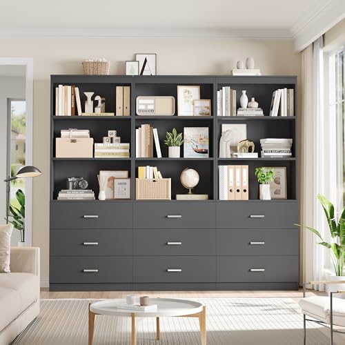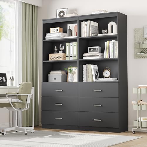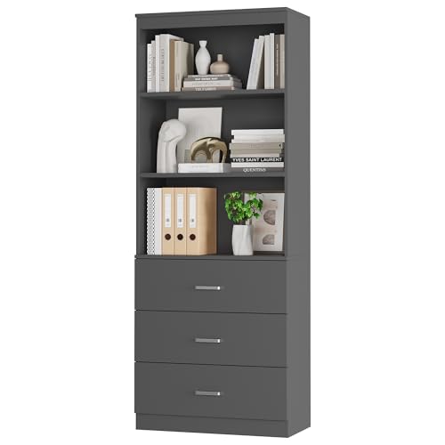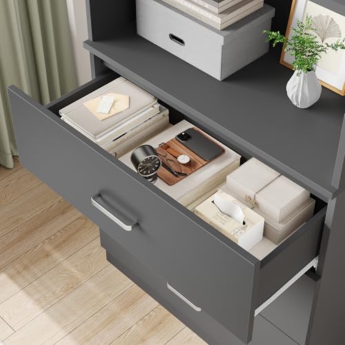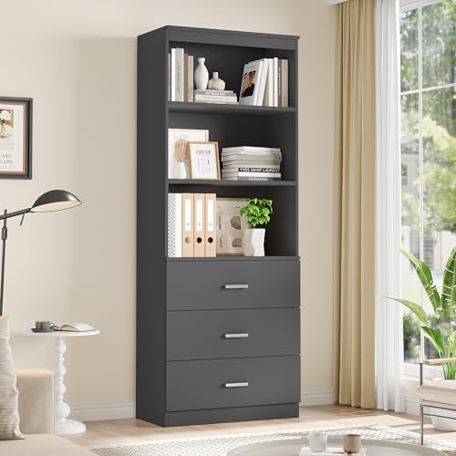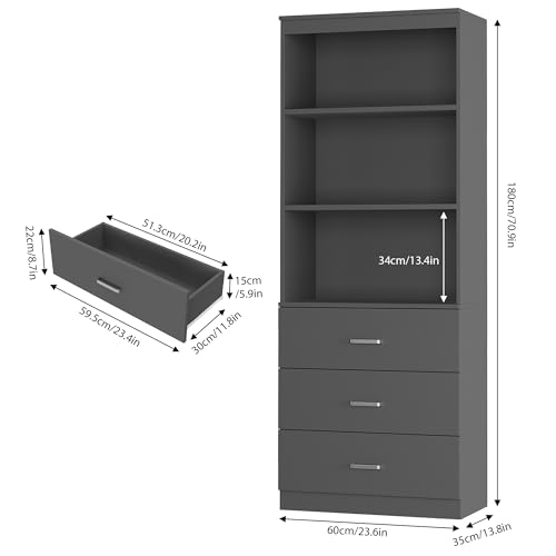 FOTOSOK - خزانة تخزين طويلة 71 انش من فوتوسوك كتب مع 3 ادراج وارفف مفتوحة طبقات منظم خشبي لغرفة المعيشة والدراسة والمطبخ والمكتب المنزلي رمادي