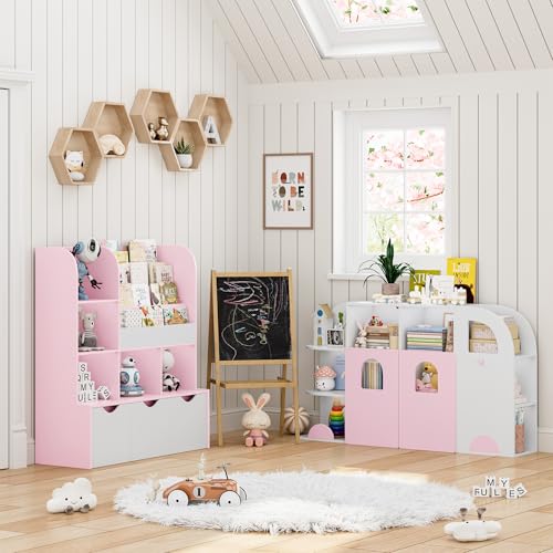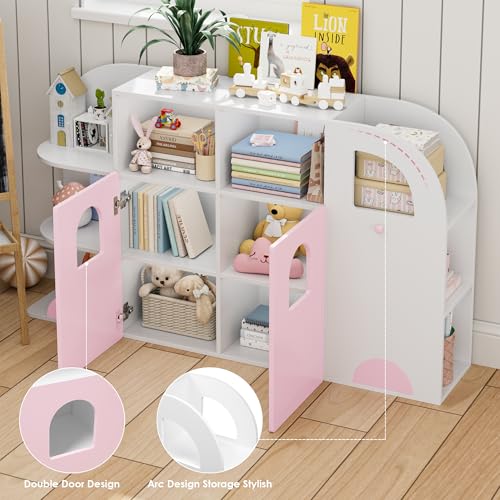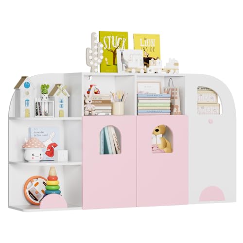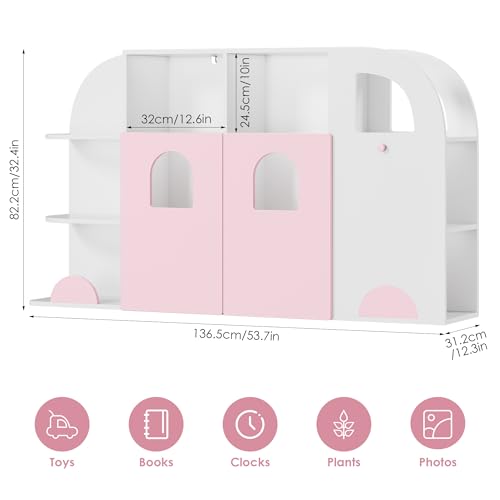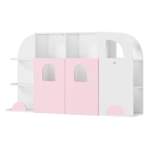 FOTOSOK - منظم تخزين العاب بتصميم شاحنة من فوتوسوك رف كتب للاطفال مع 12 مكعب وبابين وتخزين لغرفة اللعب وغرفة النوم والمدرسة والحضانة زهري وابيض خشب مُصنع ميلامين