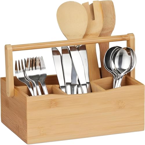 - في لمحة، هذا حامل ومنظم أدوات المطبخ من الخيزران مصمم للجلوس على سطح الطاولة؛ مصنوع من الخيزران الطبيعي، مع مقبض قابل للطي، أربع مساحات تخزين، مظهر أنيق، قابلية الحمل للاستخدام في الهواء الطلق، ومتانة تقاوم البقع.