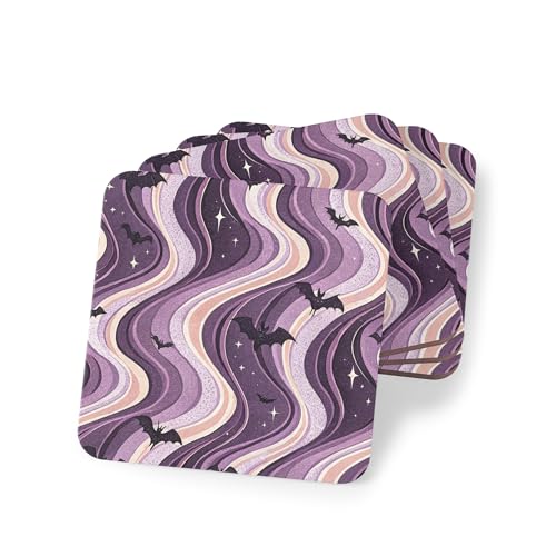 Generic - قواعد اكواب خشبية انيقة مقاومة للحرارة والماء بتصميم امواج وخفافيش بلون ارجواني للهالوين، 4 قطع - قواعد اكواب خشبية للمشروبات - 202