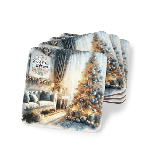 Generic - طقم قواعد اكواب بتصميم شجرة الكريسماس مكون من 4 قطع بلون ازرق ثلجي - ديكور للعطلات للاكواب والاكواب - قواعد اكواب خشبية انيقة ومقاومة للحرارة والماء، قواعد اكواب - 273