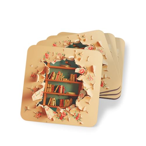 Generic - طقم قواعد اكواب خشبية بتصميم مكتبة سرية من اربع قطع - ديكور للعطلات للاكواب والاكواب - قواعد اكواب خشبية انيقة ومقاومة للحرارة ومقاومة للماء، قواعد اكواب - 294