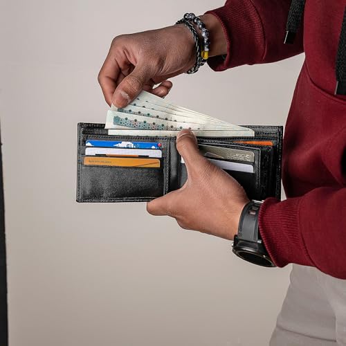 - محفظة جلد طبيعي 100% - المحفظة فو غير الرسمية مصنوعة من مواد جلد البقر الحقيقي الأعلى جودة مع خياطة متينة، مما يمنح هذه المحفظة مدى الحياة دون إظهار أي علامات تقشيرها أو قدميها عليها.