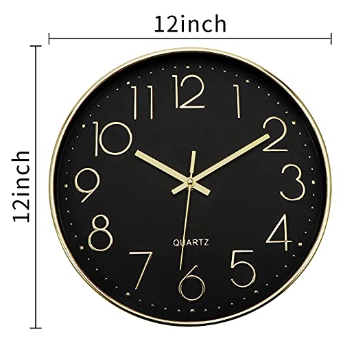 Foxtop - ساعة حائط ذهبية صامتة بدون تكتكة من فوكستوب تعمل بالبطارية بتصميم عصري بسيط للمكتب والمدرسة وغرفة المعيشة والمنزل والمطبخ النوم مقاس 30 سم بلاستيك أسود ذهبي تناظري