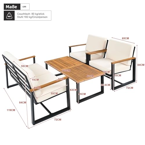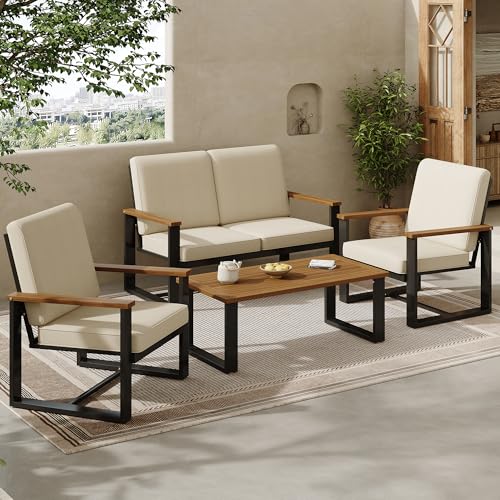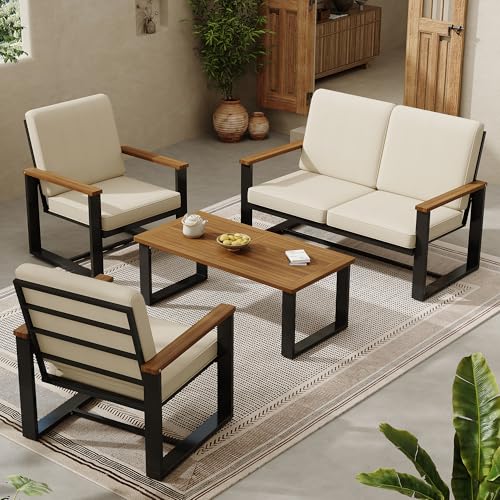 Fppuueg - طقم اثاث حديقة خارجي مكون من 4 قطع مع وسائد من اف بي بي يو يو اي جي، طقم صالة حديقة مع اريكة بمقعدين و2 كنبة فردية وطاولة باطار معدني للفناء والشرفة، بيج