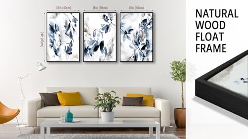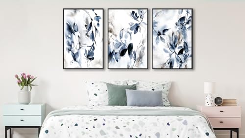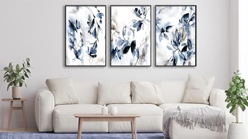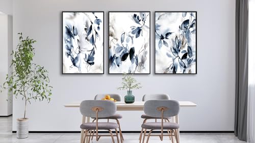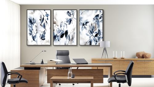 ASDCEUTICALS - لوحة فنية جدارية كبيرة بإطار بنمط زهور تجريدية بحبر مائي بلون أزرق كحلي لغرفة المعيشة وغرفة النوم والمكتب والحمام، عبوة من 3 قطع، مقاس 40 سم × 60 سم
