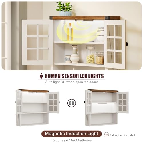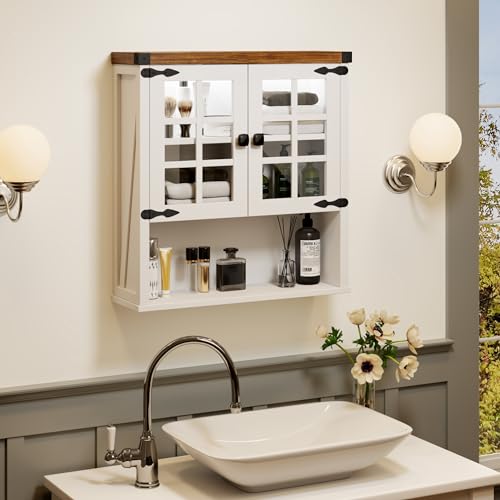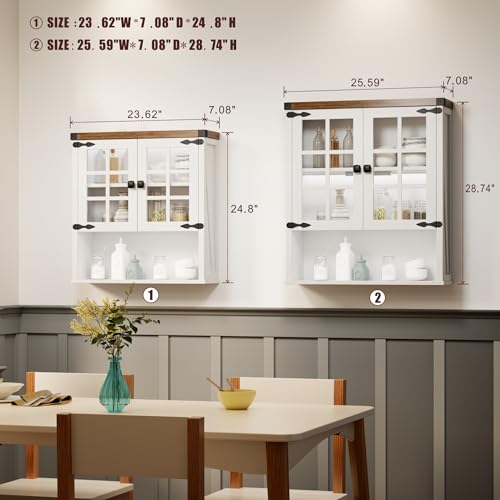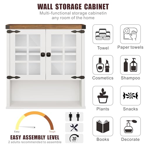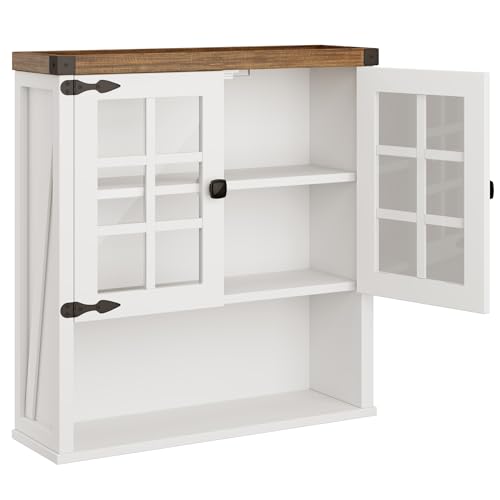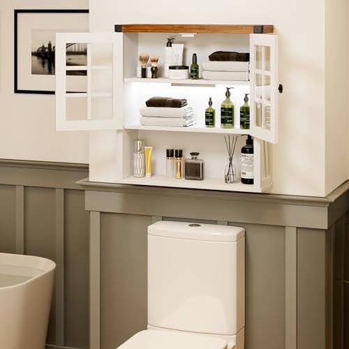 FREDEES - خزانة حمام تثبت على الحائط من فريديز تخزين فوق المرحاض لقضيب المنشفة منظم ادوية بيت المزرعة مع ابواب وارفف للمطبخ وغرفة المعيشة 24 انش عرض × 25 ارتفاع ابيض خشب