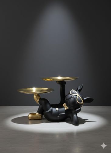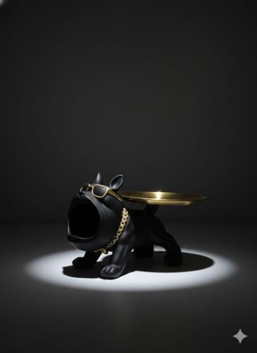 Generic - تمثال ديكور كلب فرينش بولدوج بنظارةمصنوع من الراتنج، حامل أطباق مزدوج، أسود مطفي مع تفاصيل ذهبية، منظم إكسسوارات للمنزل والمكتب