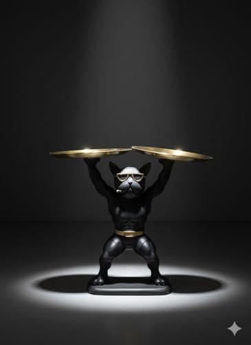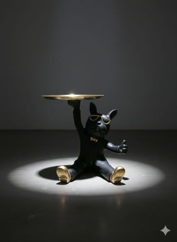 - تصميم فني مميز: مجسم كلب فرينش بولدوج بتفاصيل كوميدية مرحة، مصنوع من الريزن باللون الأسود المطفي مع لمسات ذهبية لامعة على النظارة والحذاء والحزام