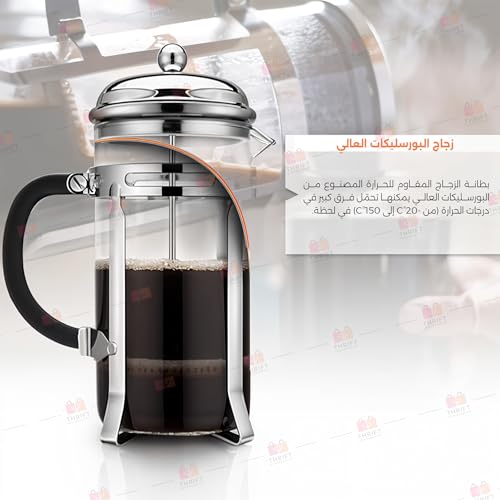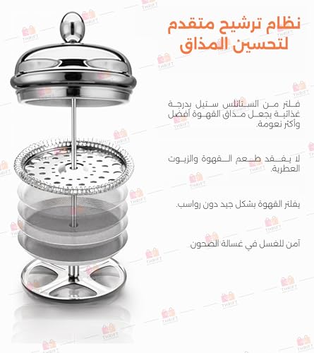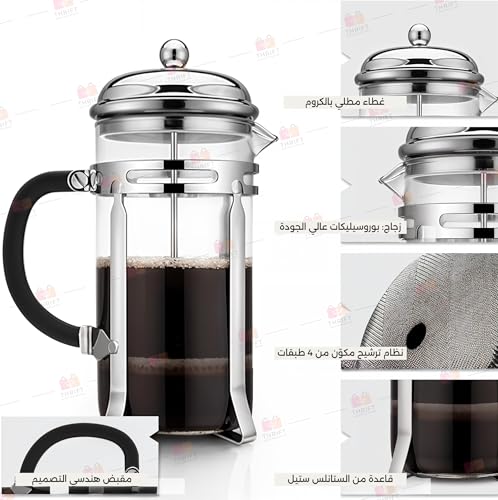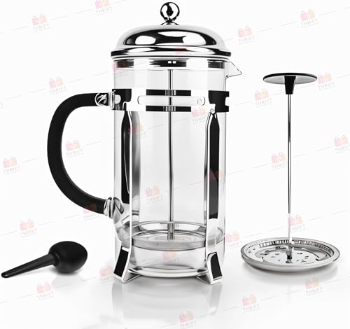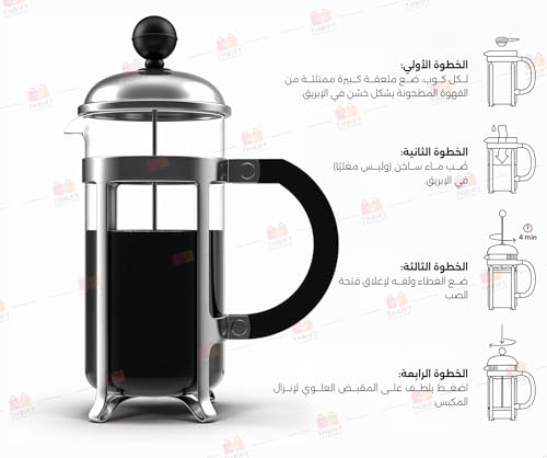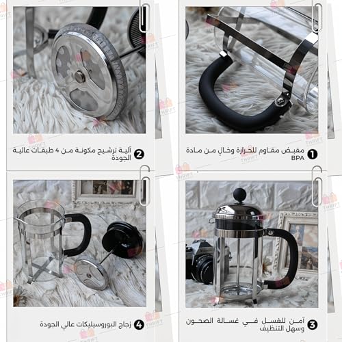 Thrift - ماكينة تحضير القهوة الفرنسية، ماكينة صغيرة من زجاج البوروسيليكات سعة 350 مل مع فلتر من الفولاذ المقاوم للصدأ بـ4 مستويات، مقاومة للحرارة وخالية من البيسفينول أ وسهلة التنظيف