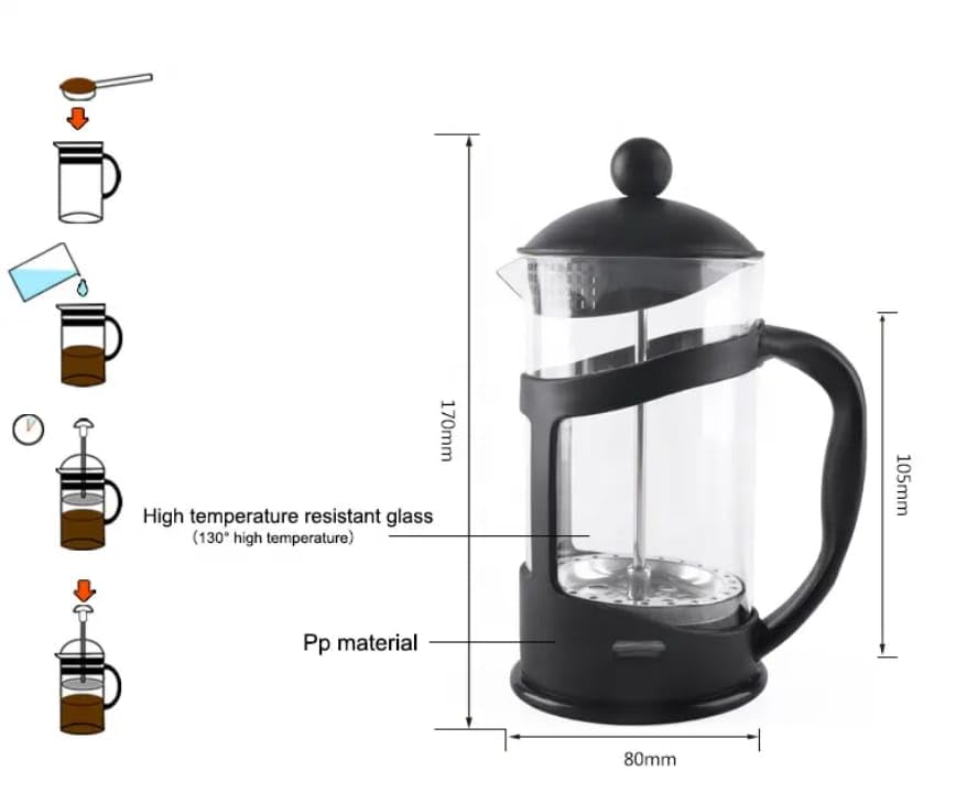 - سهلة التنظيف: ماكينة تحضير المشروبات بالضغط الفرنسية مصممة لسهولة الفك والتنظيف، مما يجعل الصيانة سريعة وخالية من المتاعب.