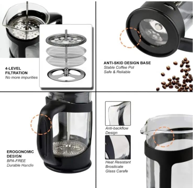 - تخمير متعدد الاستخدامات: رائعة لصنع القهوة والشاي، حيث تتيح لك ماكينة تحضير القهوة الفرنسية بالضغط هذه الاستمتاع بمشروباتك المفضلة بسهولة.