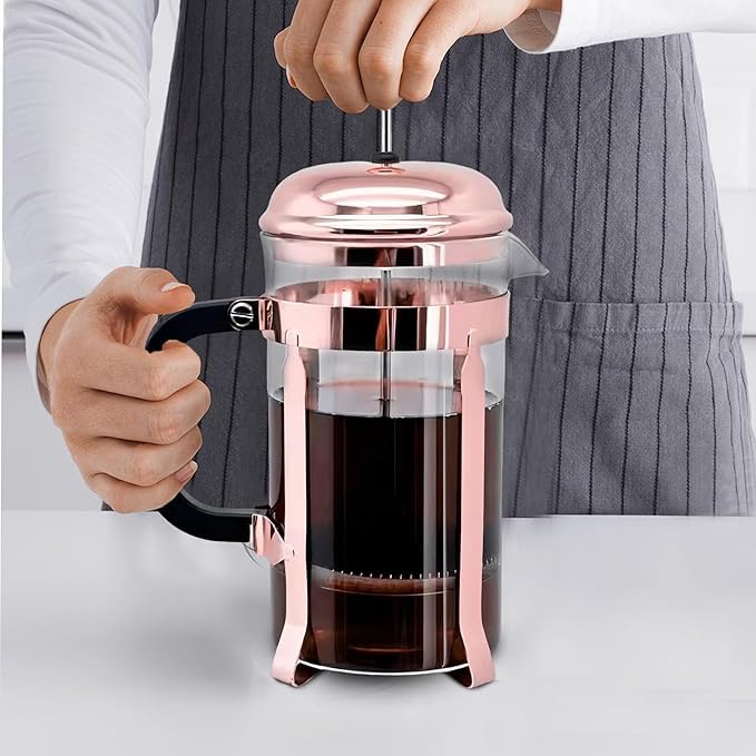 - متين ومقاوم للحرارة: صنع مكبس تحضير القهوة الفرنسية فرينش بريس الخاص بنا من مواد فاخرة، ومصمم لتحمل الاستخدام اليومي. يضمن زجاج بوروسيليكات المقاوم للحرارة والإطار القوي المصنوع من فولاذ مقاوم للصدأ متانة تدوم طويلًا.