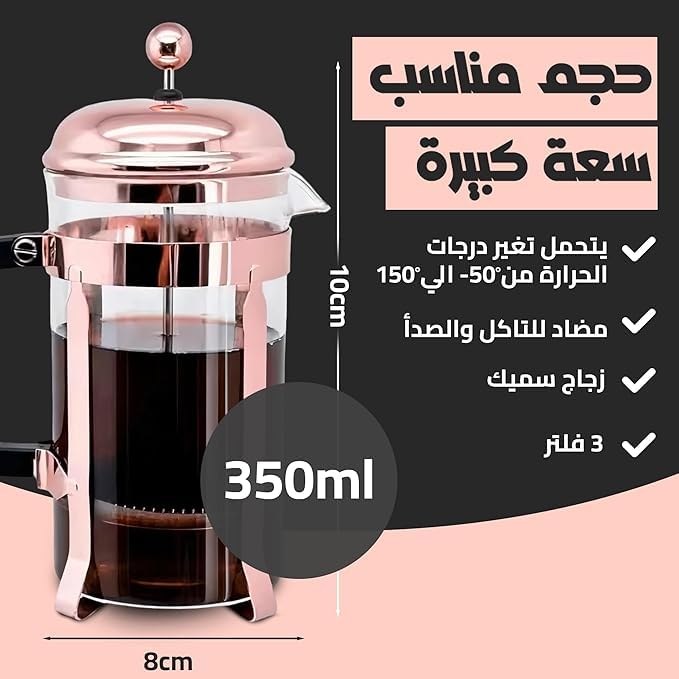 - تصميم صغير الحجم ومريح: يعتبر مكبس تحضير القهوة الصغير هذا، بسعة 350 ملليلتر، مثالي لعشاق القهوة المنفردين، حيث يتناسب بسلاسة مع أي ديكور منزل أو مكتب أو مكان سفر. استمتع بمشروبك المفضل أينما ذهبت.