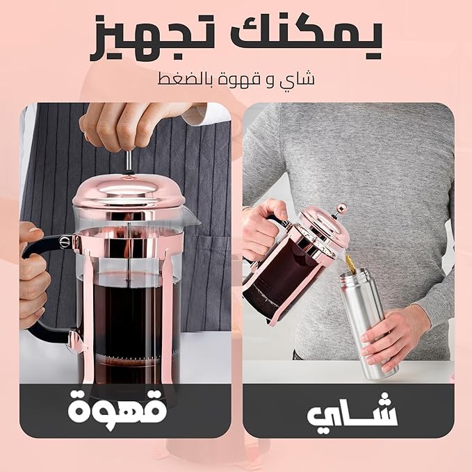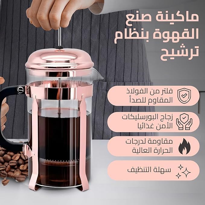 - استمتع بمذاق القهوة الأصلية: استمتع بالنكهة والرائحة الغنية للقهوة الطازجة مع مكبس تحضير القهوة الفرنسية فرينش بريس الخاص بنا، المصمم لاستخراج الإمكانات الكاملة لحبوب القهوة المطحونة المفضلة لديك.