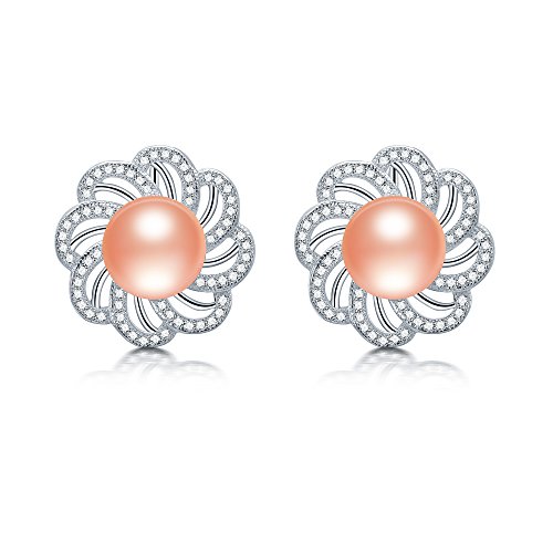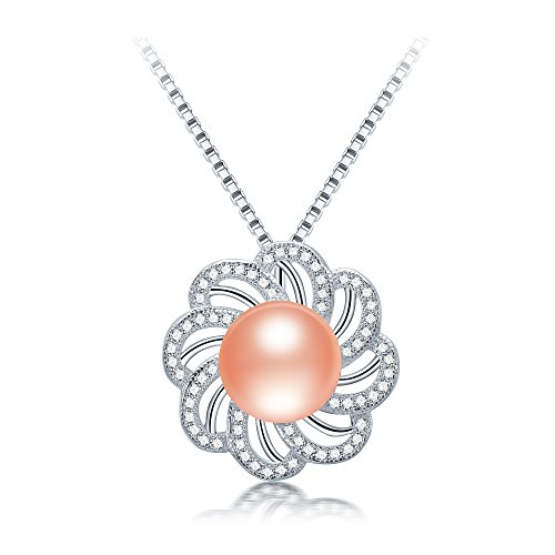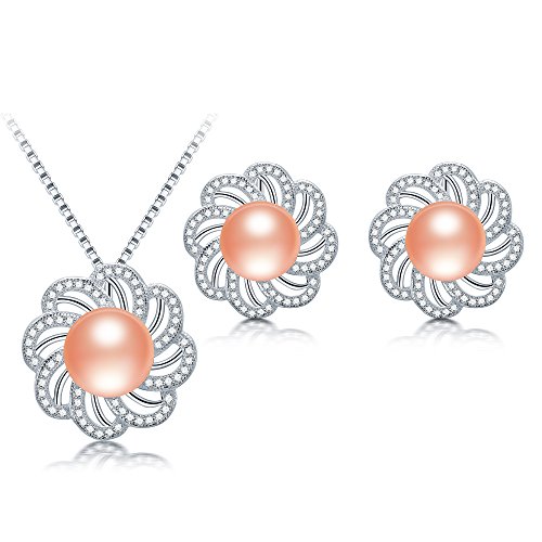 DIAMOVI - طقم مجوهرات لحفل الزفاف من سلسلة وحلق الفضة الاسترليني عيار 925 مرصع بحبات لؤلؤ المياه العذبة بجودة ايه واحجار الزركون، هدية في حفل ياتي بلوان ابيض وبينك وارجواني, فضي، دياموفي، للنساء