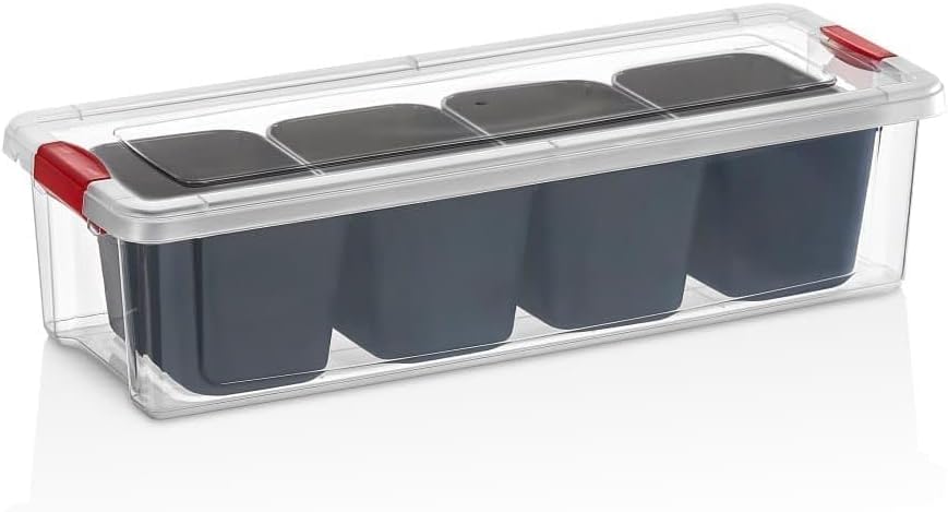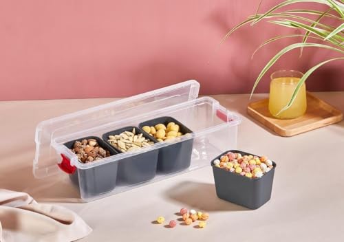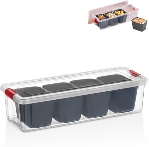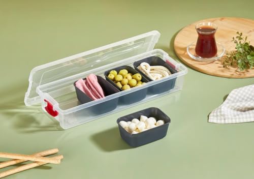 - [حاوية محمولة للوجبات الخفيفة] يمكن استخدام الأقسام الأربعة القابلة للفصل لتقديم أو تخزين المقبلات، والمأكولات الشهية، والفواكه والخضروات المقطعة، ومكونات السلطة، واللحوم، والجبن، وحشوات التاكو، والصلصات المختلفة. يتيح لك تصميم المقبض القابل للفصل في الأعلى الاستمتاع بالطعام اللذيذ أثناء سفرك. تضمن المزالج الأربعة المتينة إغلاق الغطاء بإحكام، مما يقضي تمامًا على مخاوف انسكاب الطعام ويجعل رحلتك مريحة ومطمئنة.