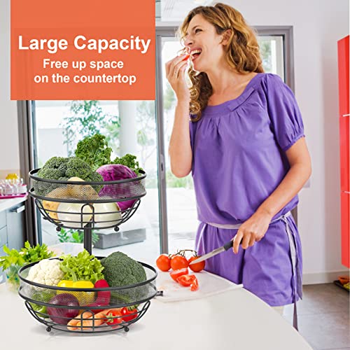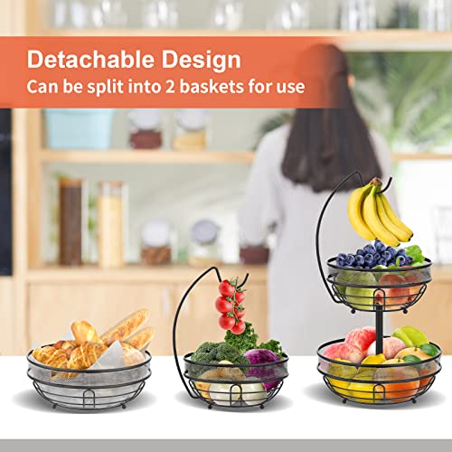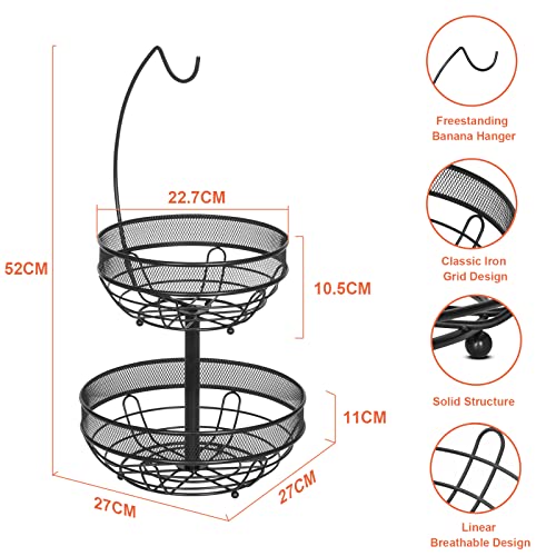 Mutool - سلة فواكه، وعاء فاكهة من طبقتين مع حمالة موز لطاولة المطبخ، رفوف تخزين معدنية قابلة للفصل تحافظ على الفواكه والخضروات طازجة (أسود)