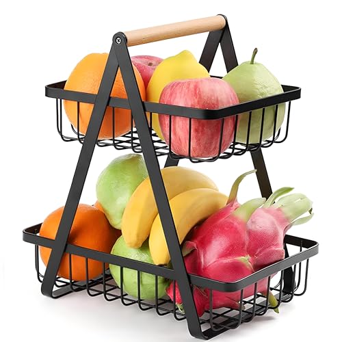 generic - سلة فاكهة - سلة فاكهة خشبية بطبقتين بتصميم سهل الوصول للمنتجات الطازجة وتخزين المطبخ، مثالية لتنظيم سطح الطاولة وعرض الفاكهة