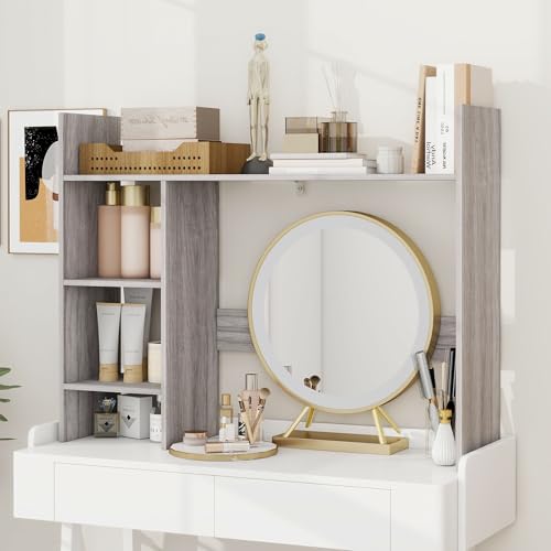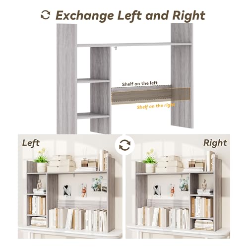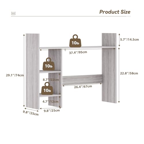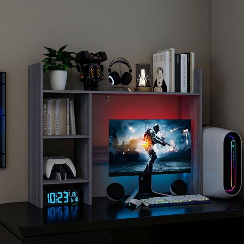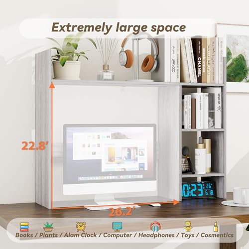 FTZxHKLX - رف كتب لسطح المكتب من اف تي زد اكس اتش كيه ال اكس، رف مكتب خشبي لشاشة الكمبيوتر حتى 27 انش مع 3 ارفف تخزين مفتوحة، منظم مكتب كبير من 4 طبقات للسكن والمكتب والمنزل، رمادي باهت